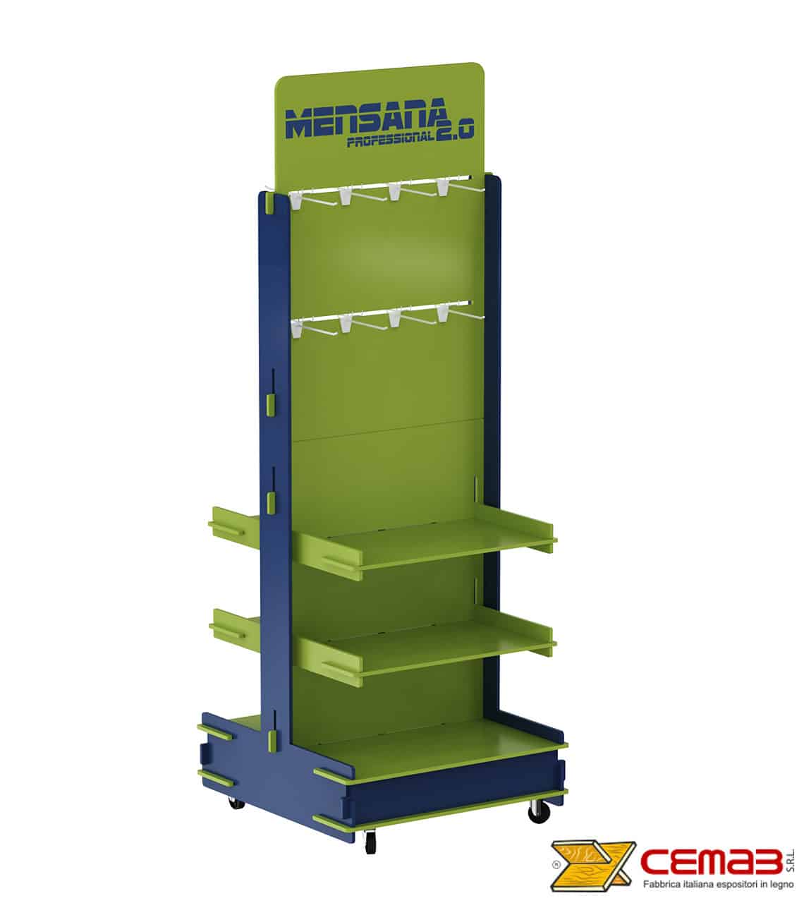 Espositore da terra in legno, con ripiani ganci e ruote, colore a scelta, personalizzabile con stampa del logo. Ideale per prodotti in blister e da scaffale.